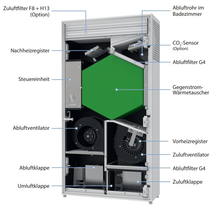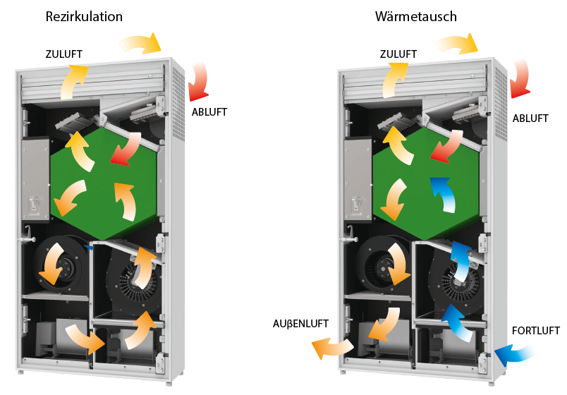 Die Zu- und Abluftklappen sind geschlossen, wenn die Luftreinigungsfunktion aktiviert ist. Die Umluftklappe ist geöffnet. Die Raumluft zirkuliert durch die Filter und kehrt gereinigt in den Raum zurück.